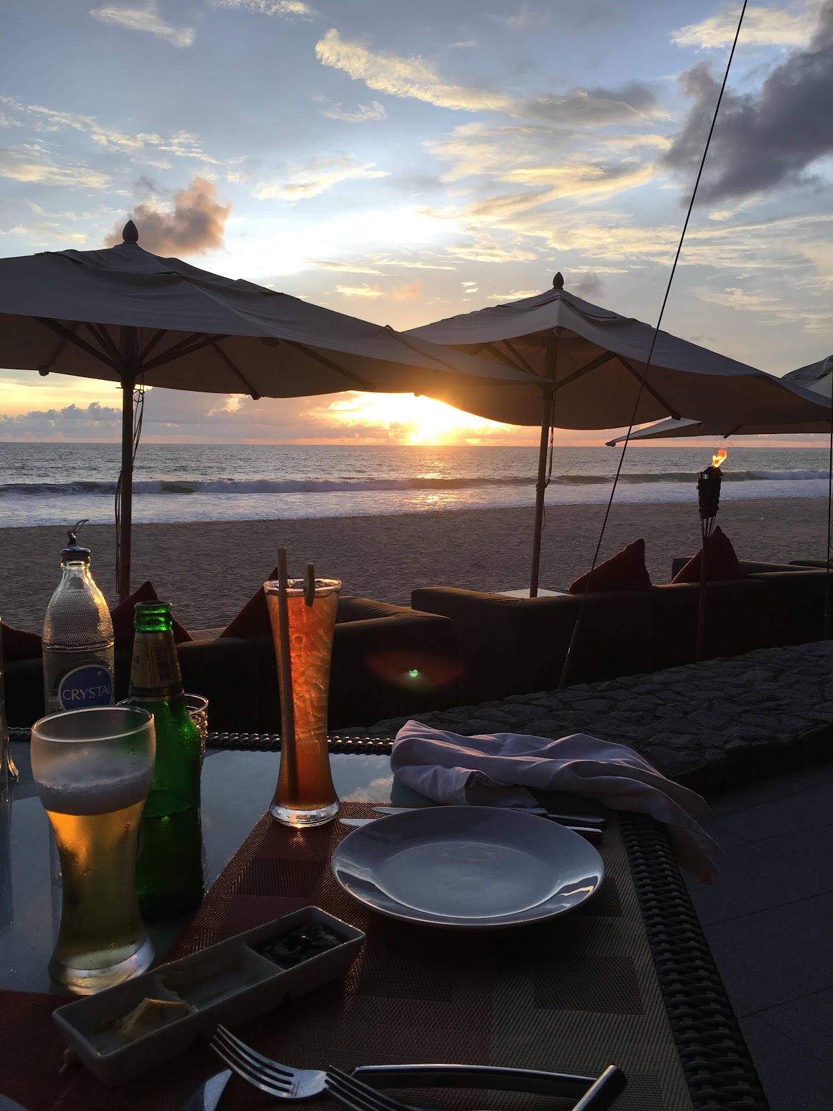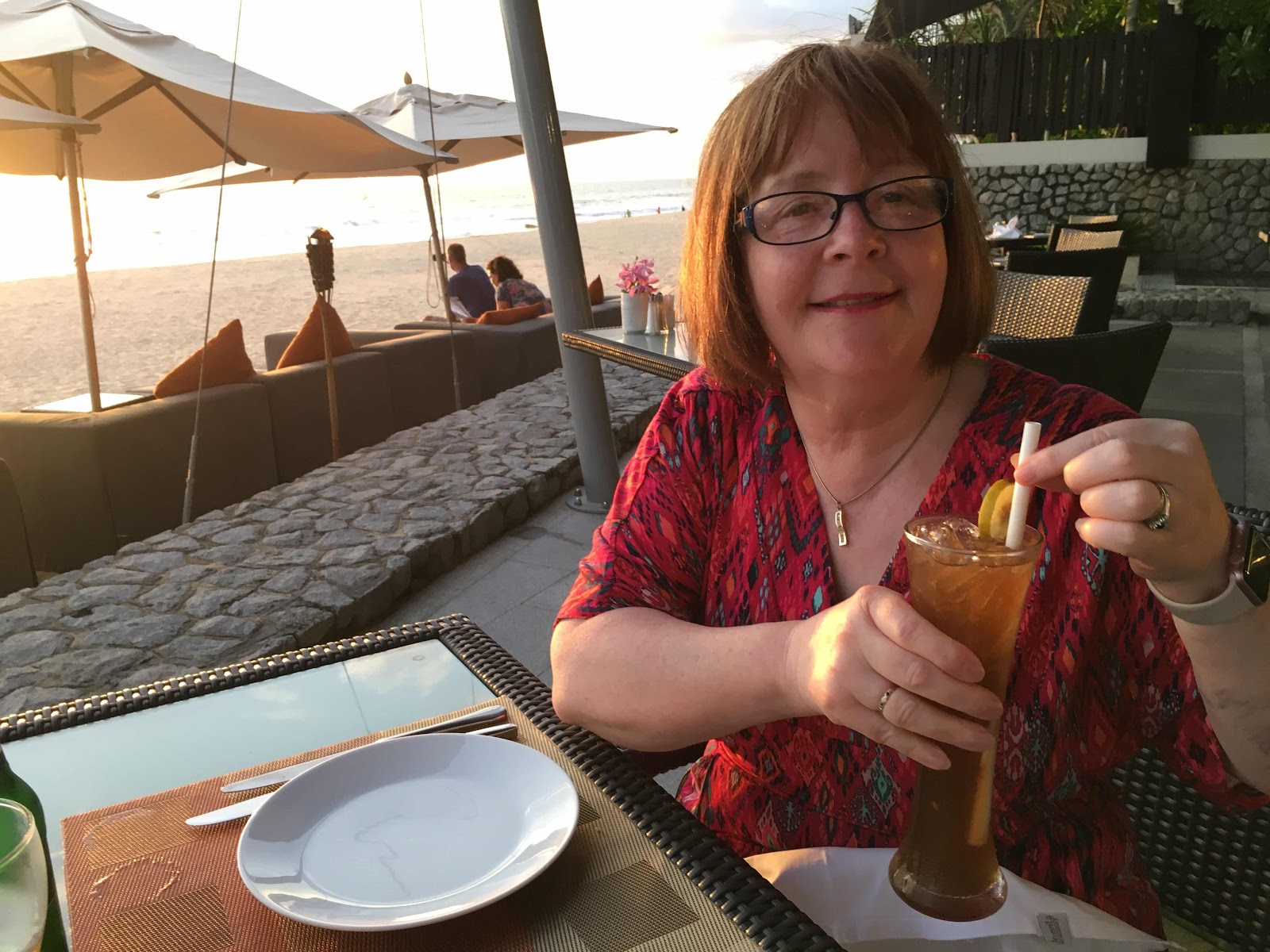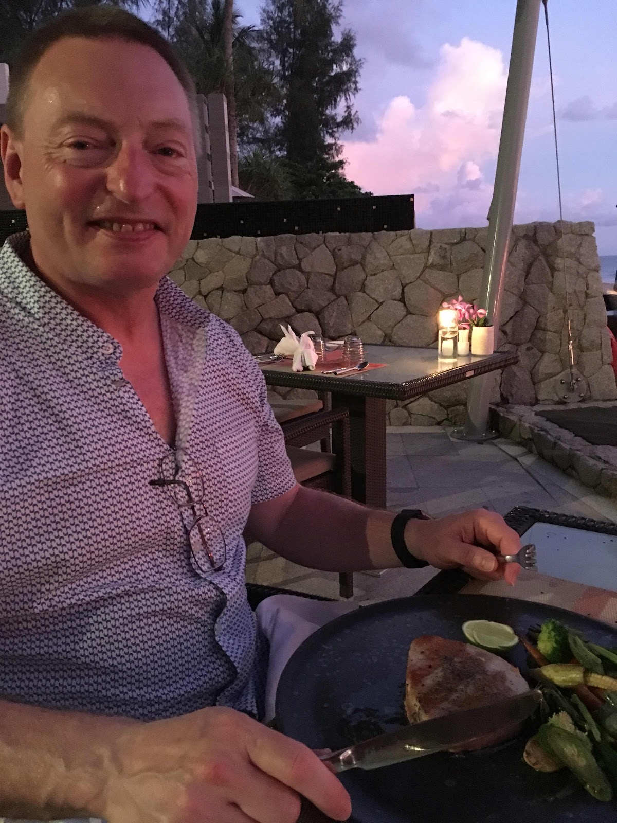 As I sipped my Long Island iced tea the sun dipped lower and lower, there were a few clouds and the colours were amazing. In front of us and behind all the colours you can imagine. It was magical. The waiters were really attentive, even when the other couple joined us in our private restaurant. We started with scallops, then Ian had tuna, the best he had ever had, and I had snapper. Delicious.