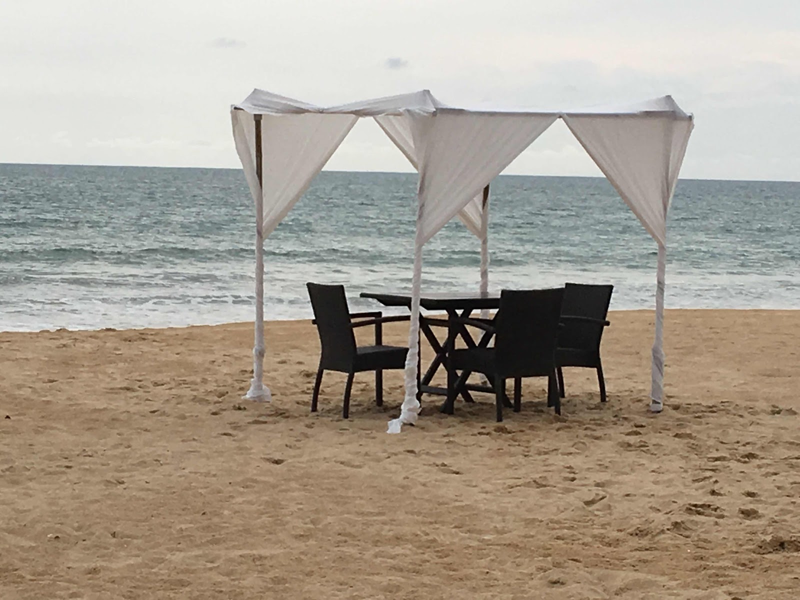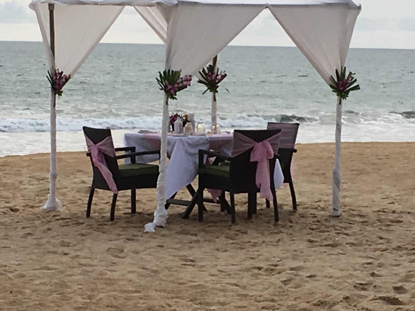 But wait. What’s that itchy spot on my arm. Good god, Another! I am keeping the 100% DEET with me at all times now, and spraying it liberally. No sign of the maid this morning so we had the left over fruit from yesterday then suncreamed, savloned, DEETed, skin-so-sifted, and hudrocotisoned up before going down to the beach. We sat on the beach settees and watched the world go by. Well, not much going by went on, in fact none at all. The staff did take a while erecting a pagoda on the beach, presumably for a romantic meal later. We wondered if it was the footballer and his leather clad lady. But that was about all the excitement.